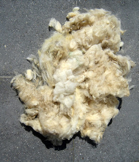 Een berg vieze, stinkende, vettige wol. Van een echt schaap. Zo van het schaap, in een tas, naar onze tuin.